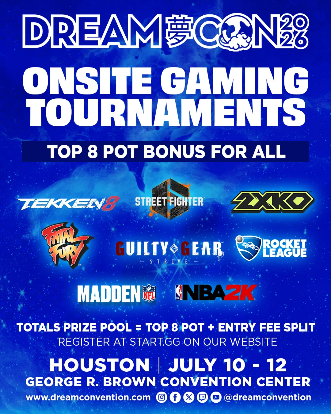 The Dream Con Gaming Start.gg is live! Click the link below for the tournament you’re interested in signing up for to register early! Check the official Dream Con website, app, and social media for registration details on all our online and onsite titles. Sign up now to secure your spot in your favorite tournaments and exclusive gaming sessions!